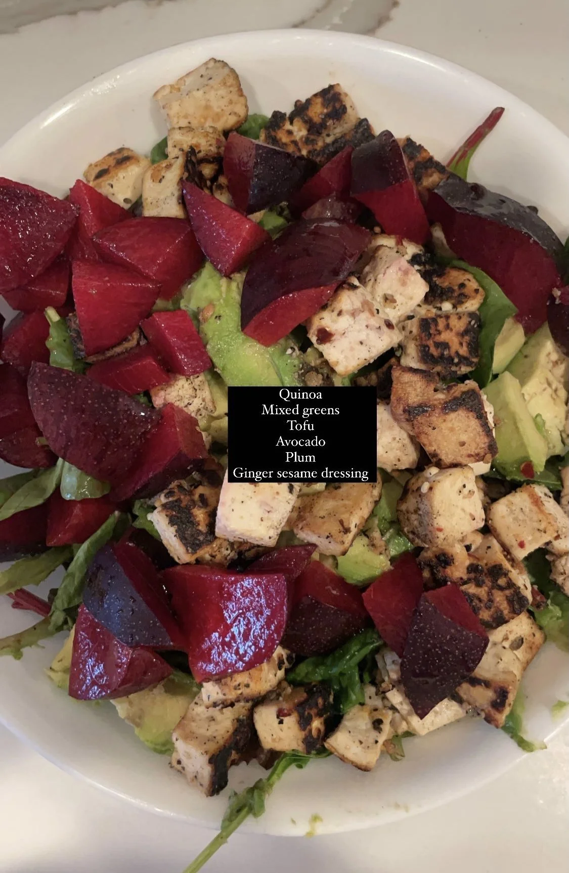It is early August and plum season is still in full swing until October. Here’s a summer bowl that will keep you full for the day with carbs, healthy fat, and protein for a balanced diet. I will preface this by saying I am no chef: I am a writer, singer and body builder, that needs high protein, plant-based food to support my lifestyle. I am also a busy, busy woman, and don’t often spend time marinating or going the extra mile for my food at this stage of my life, but hopefully can start once I get a better handle on planning and prepping my meals. The food I eat every day is quick, delicious, and versatile.